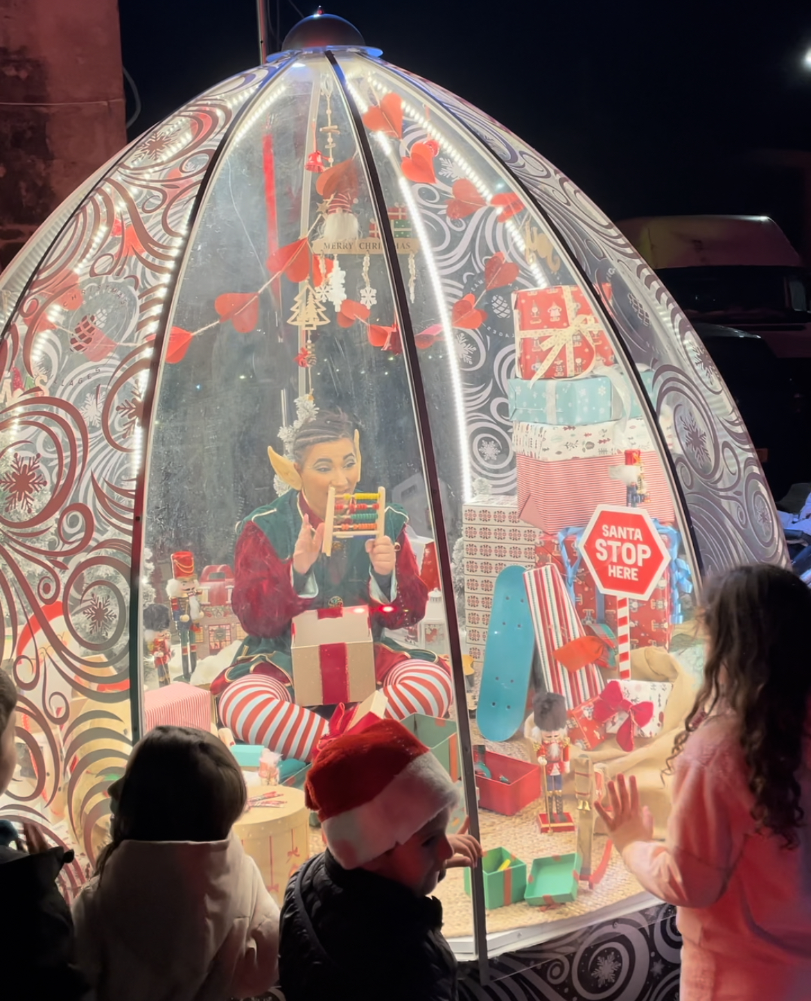 במתחם נוסף של הכפר מצאנו את סנטה קלאוס בביתן מיוחד מצטלם עם ילדים ושדון כריסמס בתוך בועה ענקית עם המתנות של הכריסמס מוקף בילדים מקומיים נלהבים.